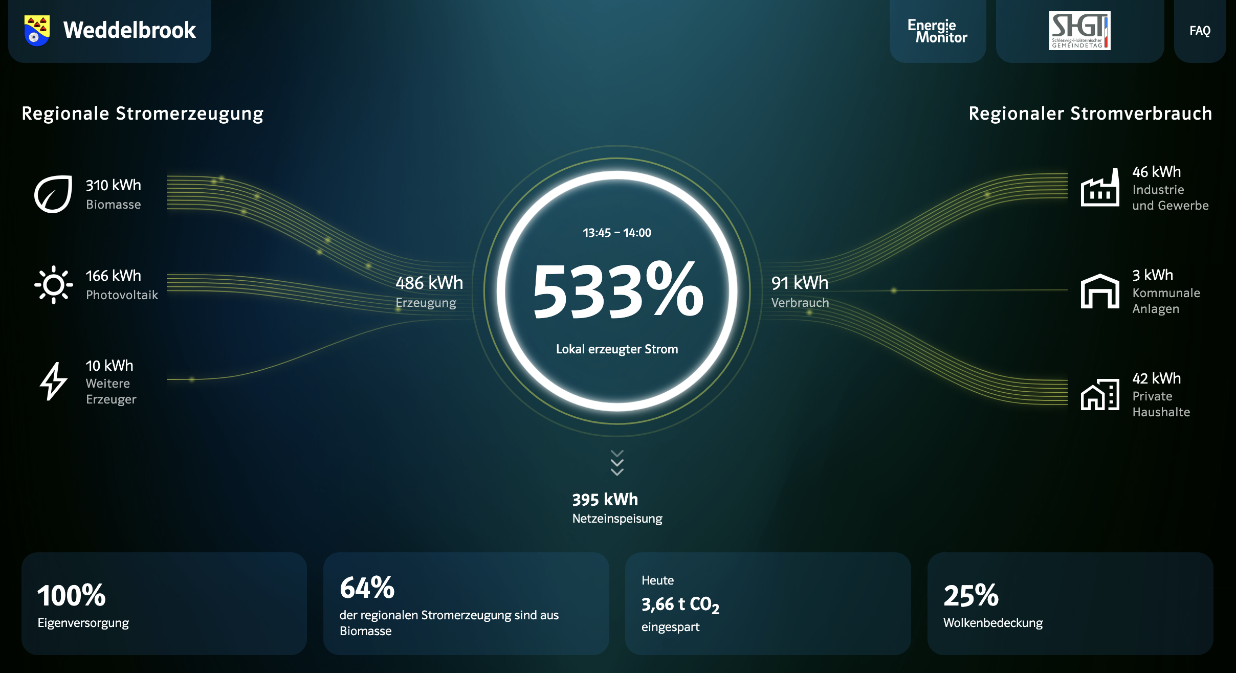 Der EnergieMonitor der Schleswig-Holstein Netz GmbH veranschaulicht die aktuelle Energiesituation in den Kommunen, Ämtern und Landkreisen Schleswig-Holsteins: Er stellt die lokale Stromerzeugung z.B. aus Photovoltaik, Windkraft oder Biomasse dem örtlichen Stromverbrauch gegenüber.
