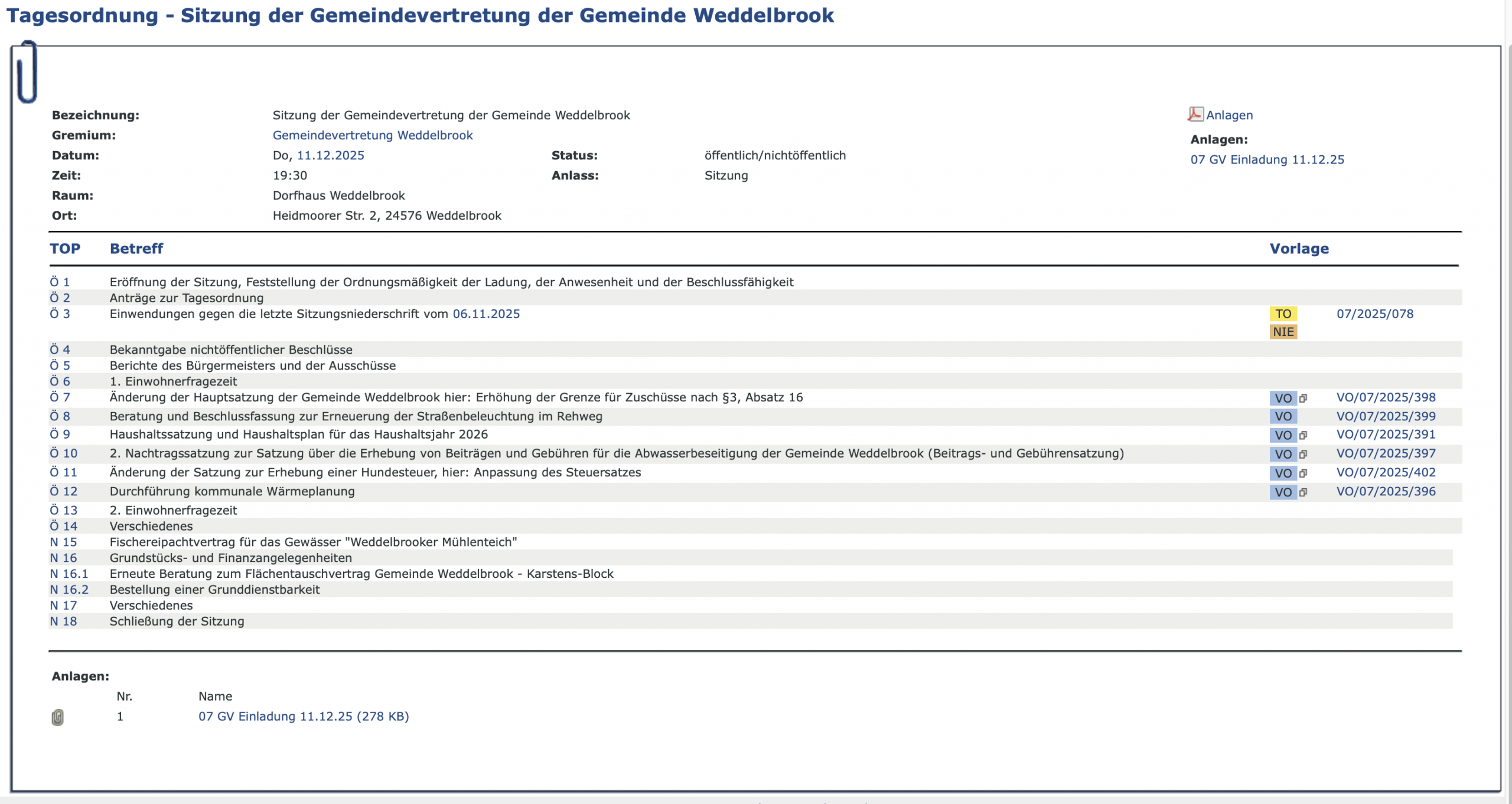 Donnerstag, 11. Dezember: Sitzung der Gemeindevertretung / 19:30 Uhr / Dorfhaus / ➞ Zur Tagesordnung